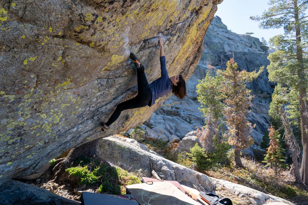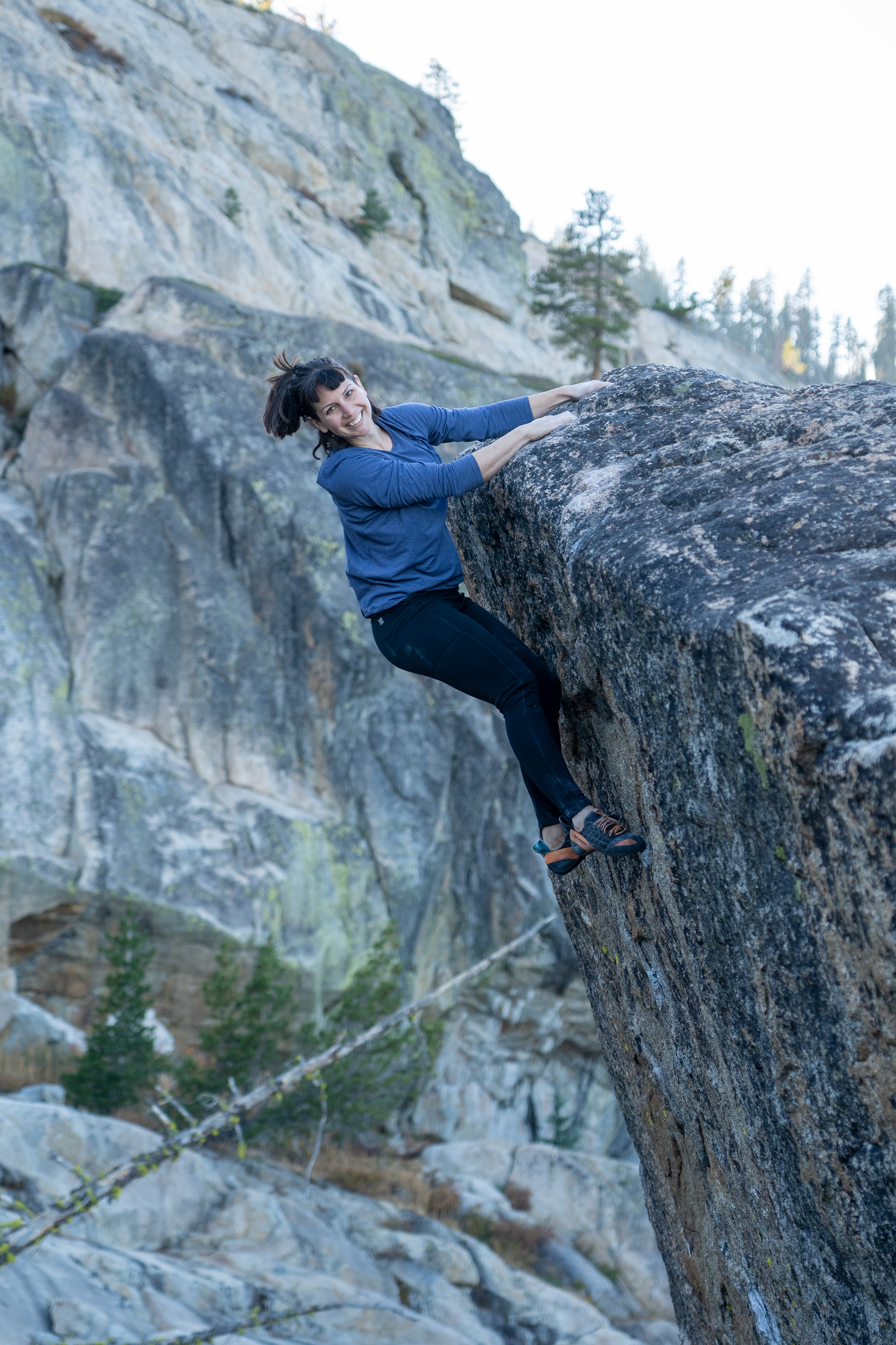 I think back to the smoke and to being isolated inside, I see the hills of Tahoe around, grey peaks and green trees, grand lakes and snow capped hills. Someone makes me laugh and it’s clear – I can do this. I focus, moving on the rock with ease. As I get higher my heart starts to race. There’s no turning back now. My friends call to me, “we got you!” I enter the no fall zone, focus dialled completely in, and then I am at the top.